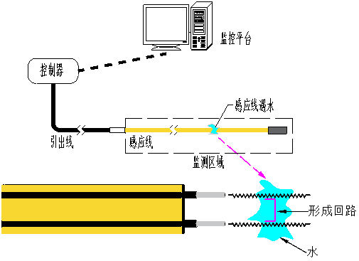 當有液體與感應(yīng)線接觸時,兩根感應(yīng)線內(nèi)芯線遇液體導通,形成回路,測漏控制器檢測到漏液情況,發(fā)出報警信號。