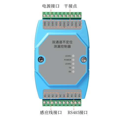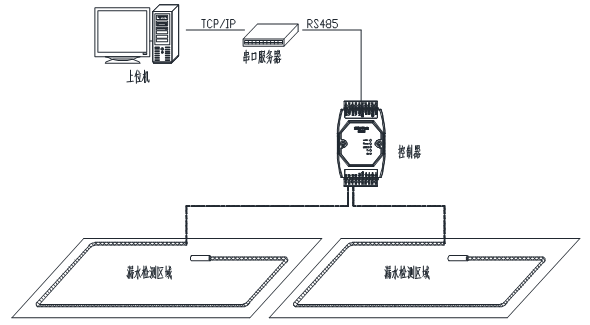 控制器與感應(yīng)線連接,監(jiān)測(cè)一塊或兩塊區(qū)域的泄漏情況,通過(guò)RS85信號(hào)傳輸泄漏情況數(shù)據(jù),上傳至上位機(jī)??刂破骼^電器輸出信號(hào)可用來(lái)控制外圍設(shè)備如聲光報(bào)警器、電話撥號(hào)器、短信模塊、開(kāi)關(guān)量采集模塊等。